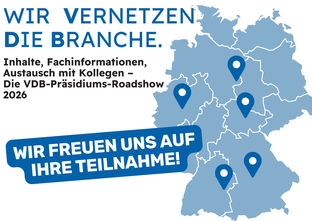 Die Plätze sind limitiert! Es können ausschließlich gewerbliche Mitgliedsunternehmen an der Roadshow teilnehmen. Der VDB bietet für jedes Unternehmen einen kostenfreien Platz. Weitere Plätze können für 19 Euro dazu gebucht werden. Melden Sie sich hier schnellstmöglich für eine Station in Ihrer Nähe an.
