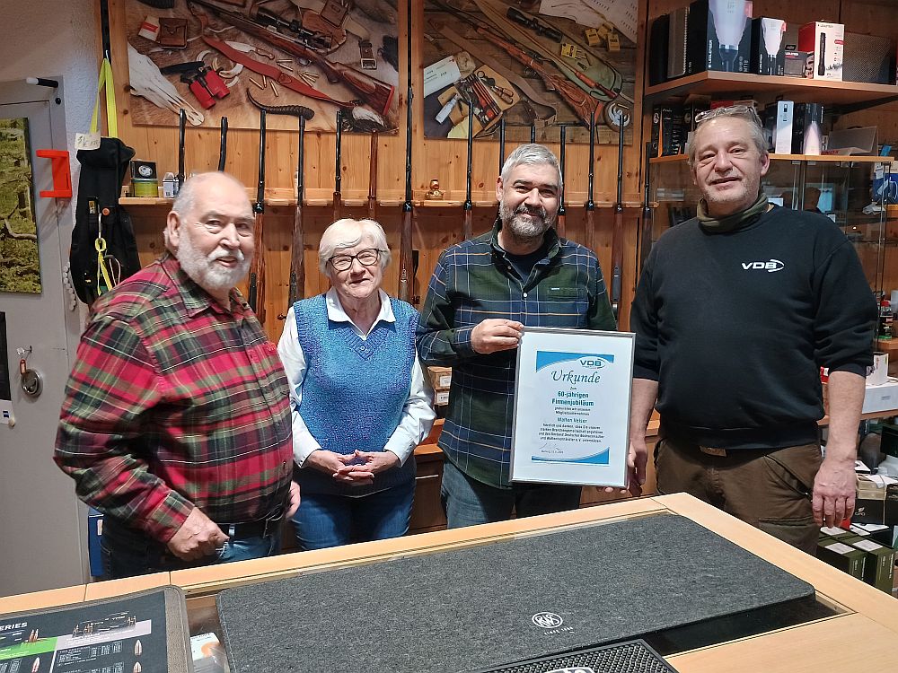 Das Familienunternehmen WAFFEN VELSER aus Nerdlen in der Vulkaneifel – auch bekannt als „98er Spezialisten“ feiert sein 60-jähriges Bestehen – und das in dritter Generation. Grund genug für den VDB, unserem Vollmitglied persönlich hierzu zu gratulieren (unser Foto zeigt (von links): Theo Velser, Ehefrau Klara Velser, Michael Velser, Frank Neis (VDB).