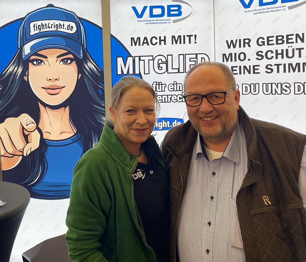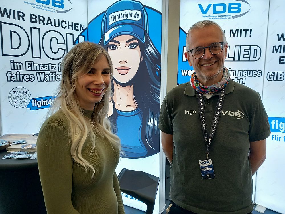 Fotos unten: Claudia Burkhardt (VDB) mit Dirk Bayer von der B&L Handelsgesellschaft Waffenhandel-Waffentechnik, VDB-Geschäftsführer Ingo Meinhard mit Irina Rompf, besser bekannt als Ballerina (@gunlikeblonde) sowie mit Stefan Roth von der SR Tactical GmbH / WBP Deutschland UG.