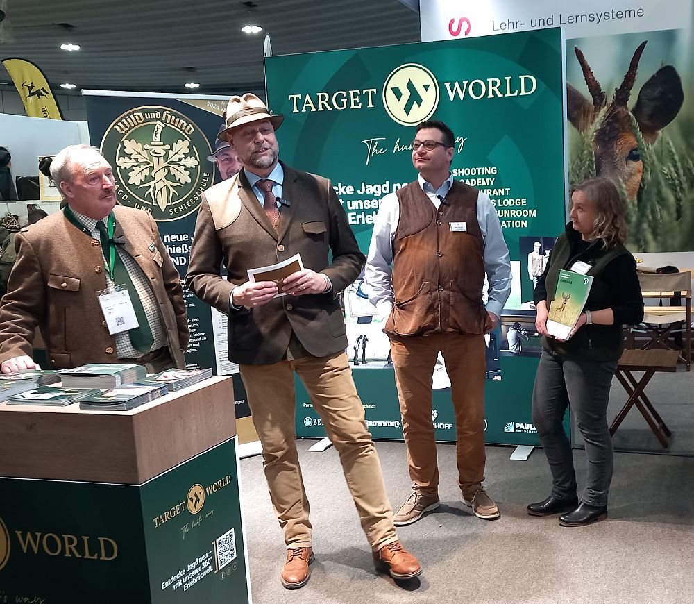 Ganz neu ist die Kooperation der Zeitschrift WILD & HUND mit unserem Mitgliedsunternehmen Target World sowie dem Lehrmaterial-Verlag Heintges. Die drei haben gemeinsam die neue "WILD & HUND Jagdschule" ins Leben gerufen. Bei der Live-Präsentation dabei waren (von links): Bernd Bahr, Vorsitzender des Bundesverbandes Deutscher Berufsjäger, Chefredakteur Heiko Hornung, Jens Ullmann, Leiter Academy und Shooting Ground bei Target World und Claudia Simonides-Weiß von der Heintges Lehr- und Lernsystem GmbH.