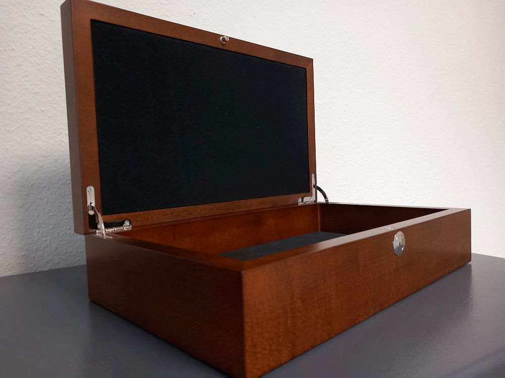 Vier verschiedene Modelle (Foto: Rosenholz, offenporig lackiert). 199 bis 399 Euro Diese Edelholzverwahrboxen sind die würdige Verpackung für Kurzwaffen. Mit Modellnamen wie „Game", „Prestige" oder „Pride" stehen sie für edle Verarbeitung von Ahorn-, Erlen-, Oliven- und Ulmenholz, sowie Nussbaum aus Kalifornien oder dem amerikanischen Erdbeerbaum. Mit bis zu 25 Lackschichten wird die Veredelung optimiert und wird von hochwertigen Metallbeschlägen und Scharnieren vollendet.