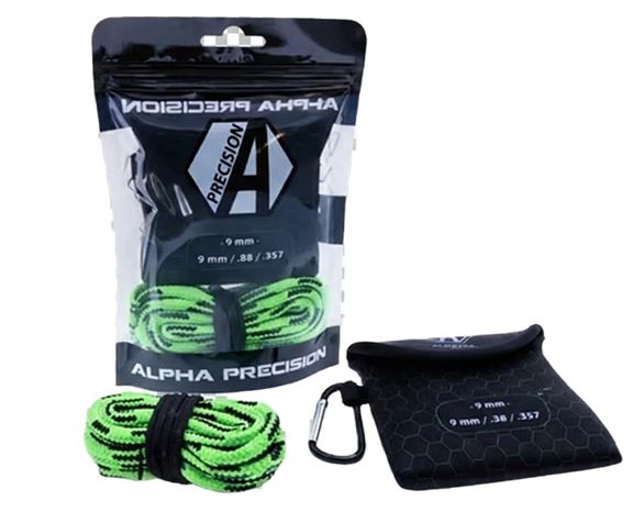 Alpha Precision Premium Reinigungsschnur – Effiziente Laufreinigung in nur einem Schritt! - Zwei aufeinander folgende Reinigungsbürsten - Praktisches Neopren-Etui mit Karabiner zeigt Kaliber und Farbe der Reinigungsschnur an – Schluss mit der Suche nach der richtigen Größe!